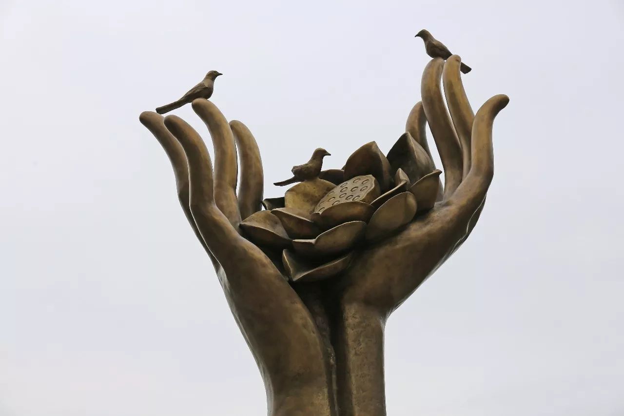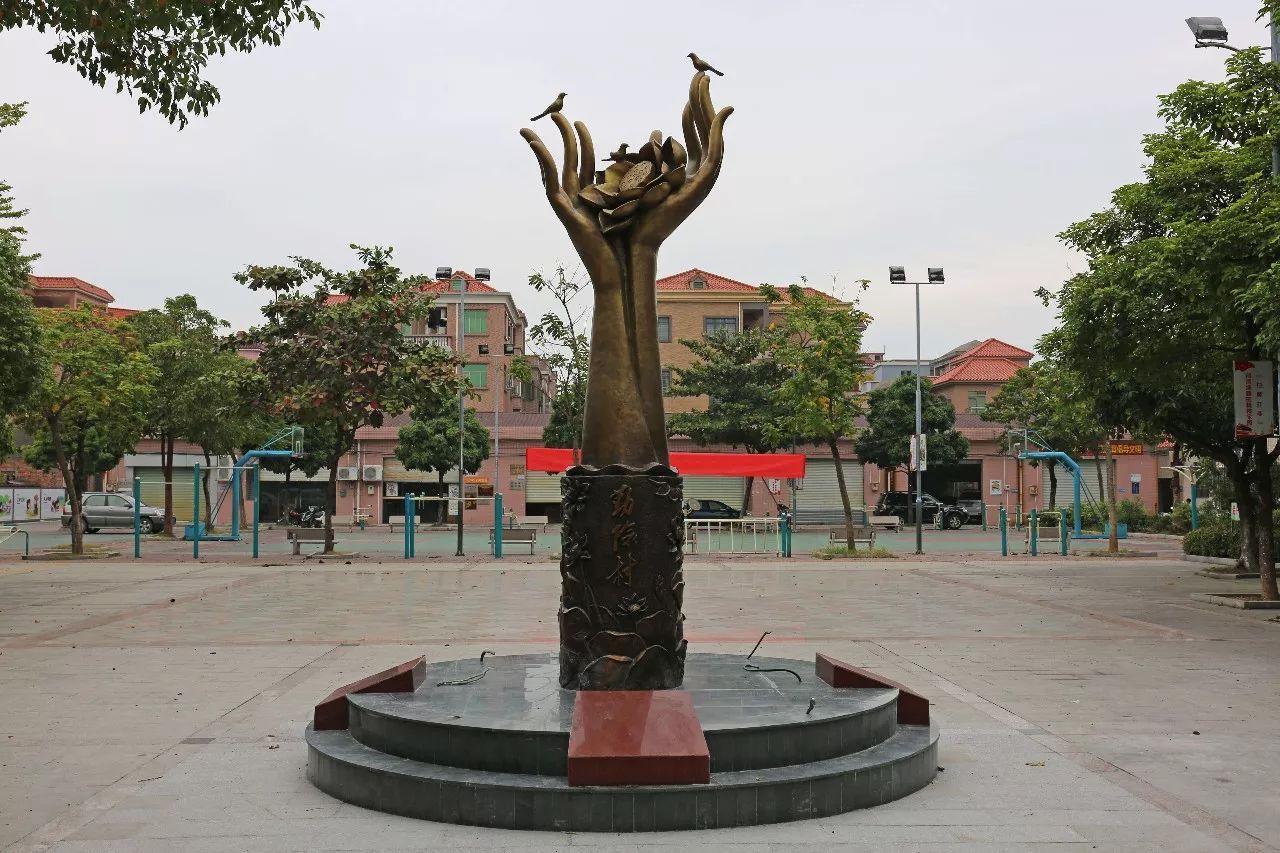 黎滘(勤儉村)雕塑位于村委廣場入口,以雙手、小鳥、蓮花為題材,雙手代表勤勞致富,蓮花代表純潔,小鳥代表美好生活,寓意黎滘勤勞簡樸的良好品德,以及開創美好生活之意。